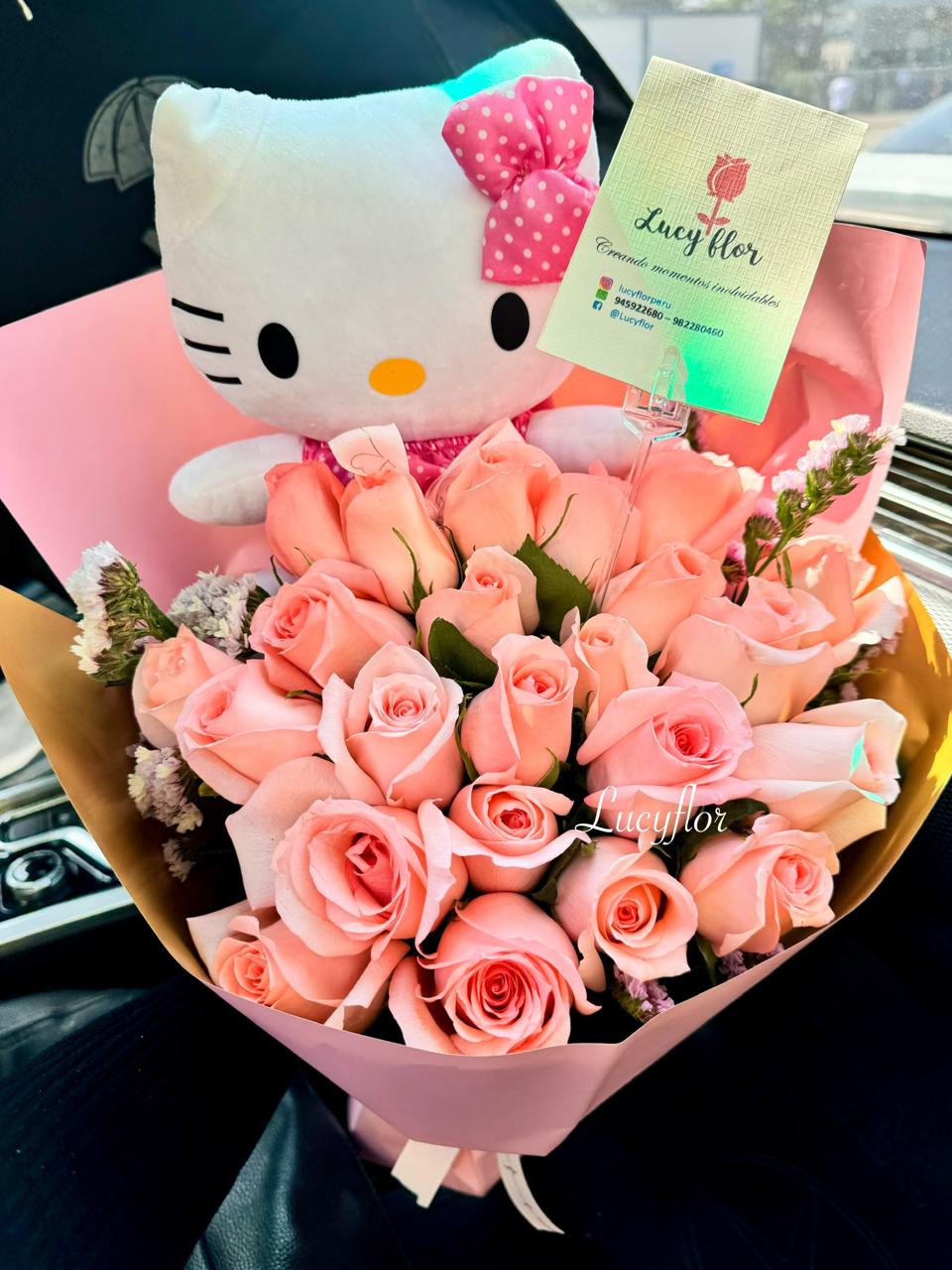 ¡Un regalo perfecto para los amantes de Hello Kitty! Nuestro ramo de rosas Hello Kitty viene con rosas de color Palo Rosa, un peluche de Hello Kitty, un lazo rosa y un empaque rosa.